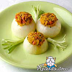 Pelar las cebollas y hervirlas durante media hora en agua salada.Escurrirlas y dejarlas entibiar. Cortar entonces una tapa y retirar la parte central.Picar la parte retirada de la cebolla junto con el [+]