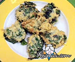 Mezclar los huevos, la leche y la harina formando una pasta lÃquida. Añadirl as espinacas cortadas en pequeños trozos y la cebolla también cortada. Condimentar a gusto.FreÃr esta mezcla por cucharadas [+]