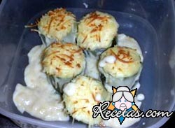 Preaparación:Poner a hervir unos minutos los calabacines cortados. Echar una pizca de sal al agua.Colocarlos en la fuente aceitada y agregarles un poco de queso rallado por encima.Cubrir con la bechamel y [+]