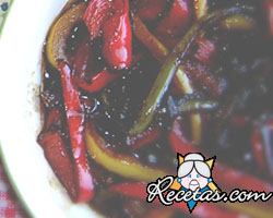 Cortar los morrones en tiras o anillos, retirándoles las semillas y las nervaduras blancas.Mezclar el vinagre, el vino, el aceite y la salsa. Bañar los morrones con esta preparación. Condimentar con [+]