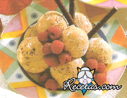 Poner el azúcar en una cacerolita. Mojar con los 10 cm3 de agua y llevar a hervir hasta obtener un almÃbar. Reservar.Limpiar las frutas y licuarlas; pasarlas por un colador.Agregar al puré de frutas el [+]