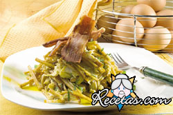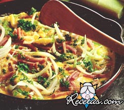 Pelar las batatas y cortarlas en bastones finos. FreÃr en aceite hasta dorar. Reservar.Saltear durante 3 minutos la cebolla cortada en láminas y la panceta en tiras. Retirar e incorporar el morrón [+]