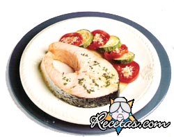 Colocar en una sartén grande los bastones de zanahoria, las rodajas de cebolla y los troncos de apio formando un enrejado. Sobre éste, colocar las postas de salmón condimentadas con sal y pimienta. [+]
