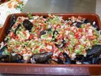 Preparación: Una vez cocidos y quitada la concha de los mejillones, se prepara un picadillo de cebolla, pimiento rojo y guisantes. Se reparte este picadillo por encima de cada mejillón y se rocÃan [+]