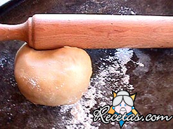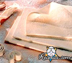 Preparación:Colocar en un bol la harina, con la sal y la margarina. Unir los ingredientes con el agua. Tomar la masa, amasando bien, estirarla hasta 1 cm de espesor, untar con los 50 gr. de margarina [+]