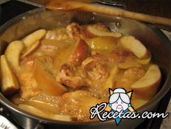 En una sartén, poner un poquito de mantequilla y dorar el pollo. Agregar las manzanas y mezclar todo. Añadir el jugo, sal y pimienta (poca) y dejar cocinar tapado y a fuego bajo, hasta que el pollo esté [+]