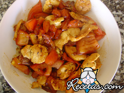 Dorar los cubos o láminas de pollo en una sartén con poco aceite.Agregar las verduras trozadas y un cuharón de caldo de ave.  Dejar cocinar a fuego bajo, hasta que el pollo esté listo. [+]
