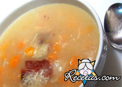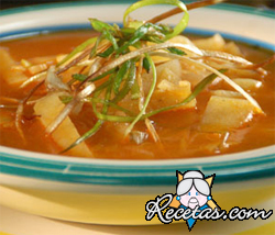Pele y corte las papas en cuadrados. Corte la cebolla en trozos y pique el apio.Ponga en una olla junto con los tomates cortados. Bañe con el caldo y lleve a ebullición. Tape la olla y cueza a fuego [+]