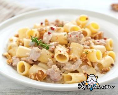 Comenzar a preparar los macarrones al gorgonzola calentando el aceite en una sartén antiadherente grande y haciendo dorar el diente de ajo. Retirarlo y agregar la salchicha privada de la tripa. Desgranar [+]