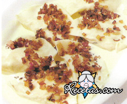 Haga hervir abundante agua en una cacerola amplia. Separe los ravioles y échelos en el agua hirviendo. Cuando suban a la superficie pruébelos; si están a punto, es decir si la masa está cocida, vuelque [+]