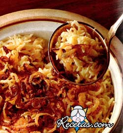 Preparación:Corte las cebollas en rodajas muy finas. Pique la panceta y caliéntela en una sartén, junto con la manteca y la cebolla. Cueza a fuego suave, con la sartén tapada, durante media hora, [+]