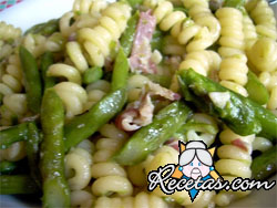 Hervir la pasta en agua salada.Derretir la manteca en una sartén y añadir los espárragos.Cuando se estén dorando, echar la nata y salpimentar.Servir los fideos con la salsa por encima. [+]