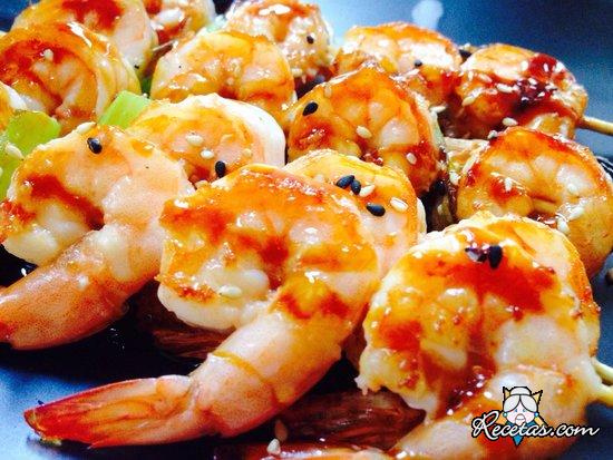 Armar las brochetas con las gambas. En un tazón mezclar el aceite de oliva virgen extra junto con el perejil picado, el jugo de limón, el pimiento rojo en trozos pequeños, los dientes de ajo bien [+]