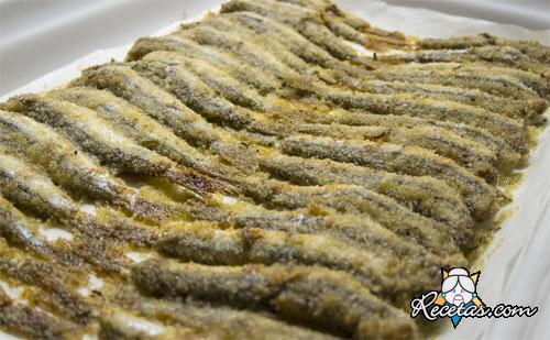 Limpiar bien el pescado en su parte externa. Cortarle la cabeza y la cola. Abrirlo por la mitad con ayuda de un cuchillo afilado y retirarle la espina central. Reservar.Cortar los dientes de ajo. [+]