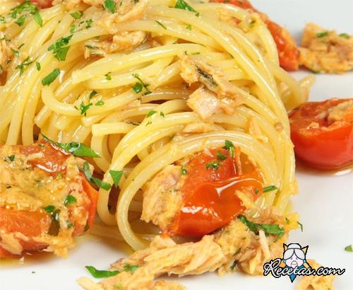 Pelar el ajo, aplastar ligeramente y freÃr en una sartén con aceite de oliva virgen extra. Escurrir el atún y agregarlo a la sartén desmenuzándolo con un tenedor. Lavar los tomates, cortarlos al medio [+]