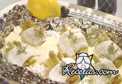 Lavar y secar el pescado y enrollar los espárragos, cortados por la mitad, en los filetes. Untar con mantequilla una hoja grande de papel de aluminio. Doblar los bordes hacia arriba, ponerle dentro el [+]