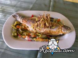 Pulir los pescados, salarlos y pasarlos por el almidón de maÃz. Cortar las verduras en tiritas o rodajas finas. Calentar aceite en una sartén y freÃr en él las truchas, de ambos lados, durante unos 5 [+]