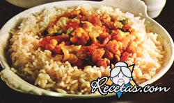 Calentar agua con sal, echar media taza de arroz y cocinarlo.Picar la cebolla, ajà y tomates. FreÃr los camarones en la mitad de la manteca y aderezarlos con sal y curry. Bañarlos con el coñac y [+]