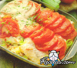 Salar los filetes de pescado, moler pimienta por encima de ellos y rociarlos con limón. Escaldar los tomates y pelarlos, luego cortarlos en rodajas.Cortar lo más verde de los puerros, quitar la hoja [+]