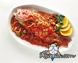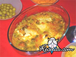 En una fuente que resista al fuego, colocar las cebollas, tomates y apio, todo cortado en rebanadas, encima el pescado entero o cortado en pedazos cubriéndolo totalmente con cebollas, tomates, [+]