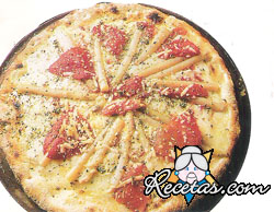 Coloque sobre la masa de pizza la salsa de tomate, encima añada la mozzarella cortada en fetas finas, disponga las puntas de espárragos y los ajÃes. RocÃe con aceite de oliva y espolvoree con el queso [+]