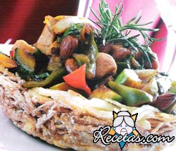 Cortar todas las verduras en juliana. Saltear con aceite y dos cdas. de vino blanco. Agregar el pollo cortado en dados de 1 cm. Saltear y agregar el resto del vino, la sal, el azúcar, el ajinomoto, [+]