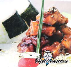 Cortar el pollo en dados de 2 cm y macerarlos con el ajo picado, el jengibre rallado, el sake y la soja. Pasarlos por el almidón de maÃz y cocinarlos en aceite a 180ºC hasta que estén bien crujientes. [+]