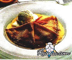 Derrita la manteca en una sartén grande. Agregue el azúcar y revuelva con cuchara de madera hasta que esté dorada. Añada el jugo de naranja y el licor. Una vez que se haya disuelto el azúcar, agregue [+]