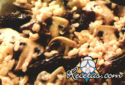 Poner a remojar los hongos secos en agua tibia. Lavar los frescos y cortarlos en tajadas. Picar la cebolla y rehogarla en la manteca hasta que se haga transparente. Agregar el arroz y saltearlo, [+]